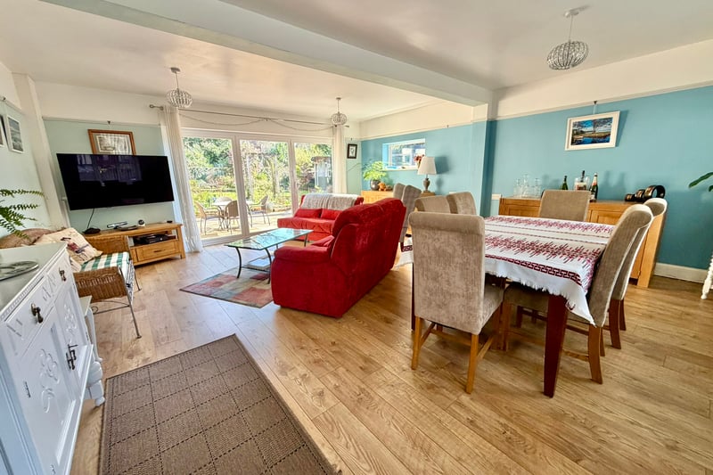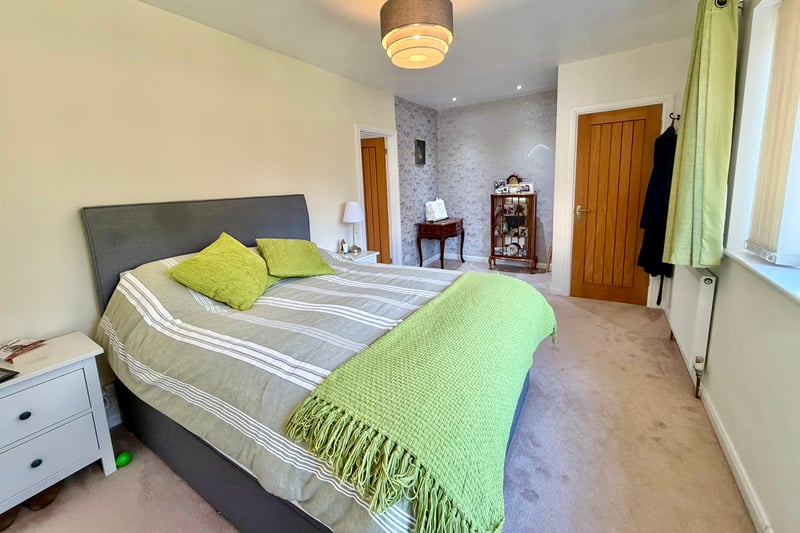 The large modern kitchen/breakfast room is truly the heart of the home, featuring two sets of casement doors that open to the patio and garden beyond. This bright and airy space offers ample room for dining, food preparation and entertaining, complemented by an adjoining utility room and cloakroom to enhance practicality.