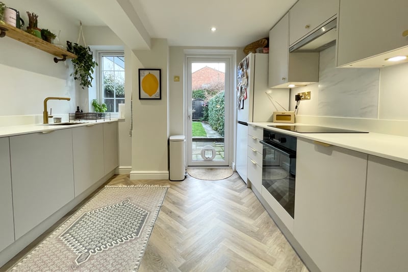 Accommodation comprises; a spacious living room complete with a log burning stove, herringbone patterned flooring and sliding sash windows with fitted shutters. The living room opens to a large dining room where the herringbone flooring flows through and the stairs to the first floor are. Adjacent to the dining room is a modern, contemporary style kitchen with composite stone worktops, and integrated appliances including; dishwasher, fridge/freezer and washing machine. There is also a double glazed door leading to the secluded rear garden.