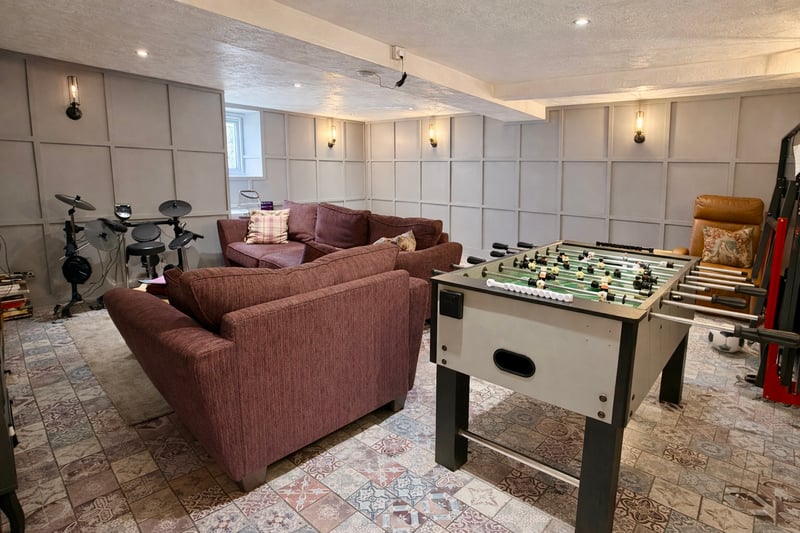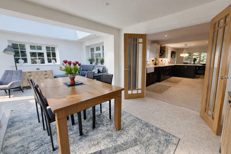 The main living accommodation is arranged predominantly across one level and centres around a stunning, comprehensively refitted kitchen/breakfast room featuring a range of integrated appliances, sleek cabinetry and a boiling water tap. This impressive space flows seamlessly into the extended rear reception area, thoughtfully designed to create clearly defined yet sociable zones for dining and relaxation. A striking sky lantern floods the space with natural light, while large openings frame delightful views across the garden, enhancing the bright and airy feel throughout.