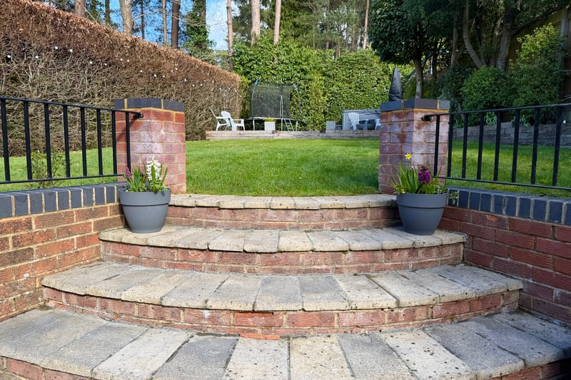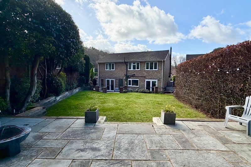 Externally, the property enjoys a well-maintained rear garden, featuring a large patio area immediately adjoining the house, ideal for outdoor dining and entertaining, with steps leading up to a substantial lawned area. At the rear of the garden there is a further seating area, providing an additional private space to relax.