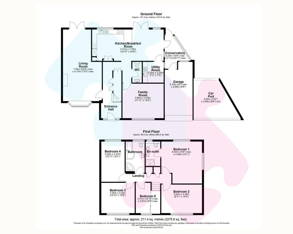 To the first floor the property offers five well-proportioned bedrooms, including a large double aspect principal bedroom with en-suite shower room. The remaining bedrooms are served by a spacious family bathroom.